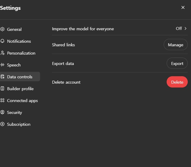 Setting (설정) -> Data control (데이터 제어) -> Improve the model for everyone(모두를 위한 모델 개선) -> Off(꺼짐)